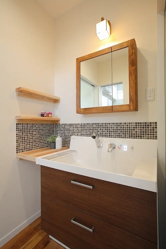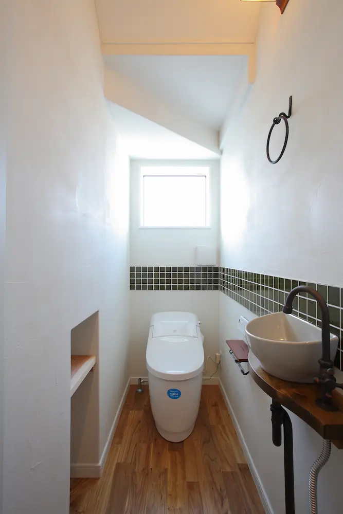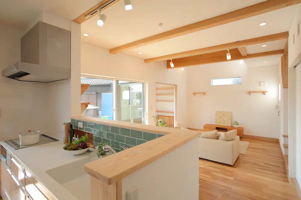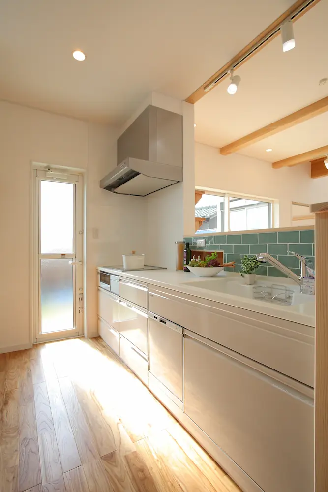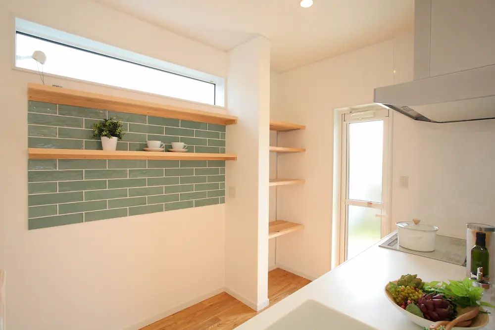 キッチンはリビングダイニングまで見渡せる対面スタイルで、グリーン系タイルのアクセントが空間に爽やかな表情を添えています。