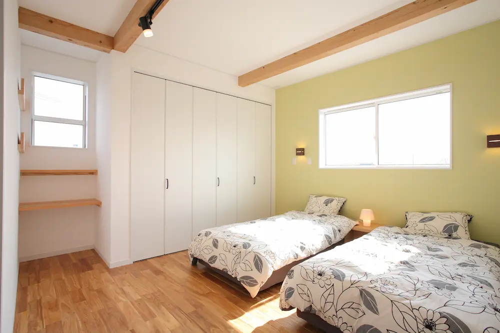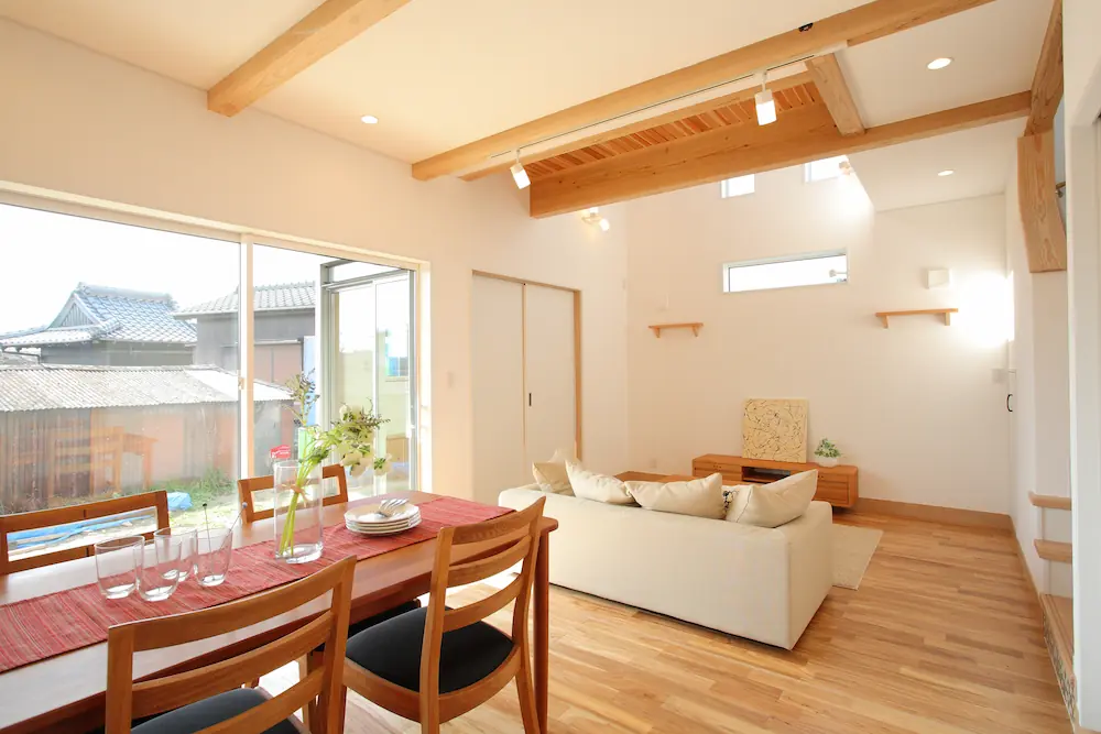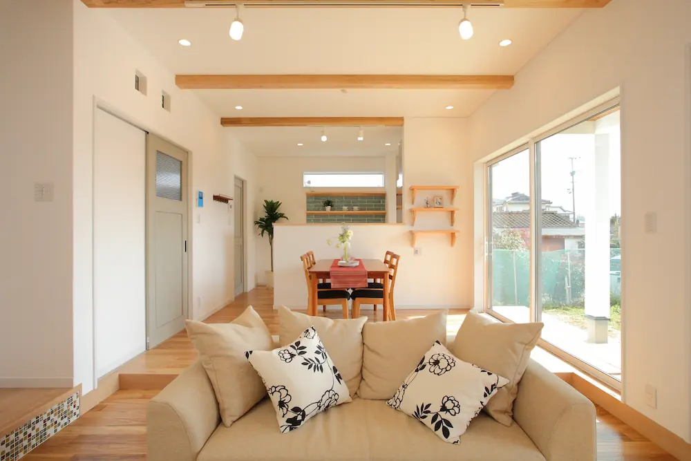 自然光がたっぷりと入る大開口の窓と、やさしい木の質感を組み合わせた、明るく開放的な住まいです。