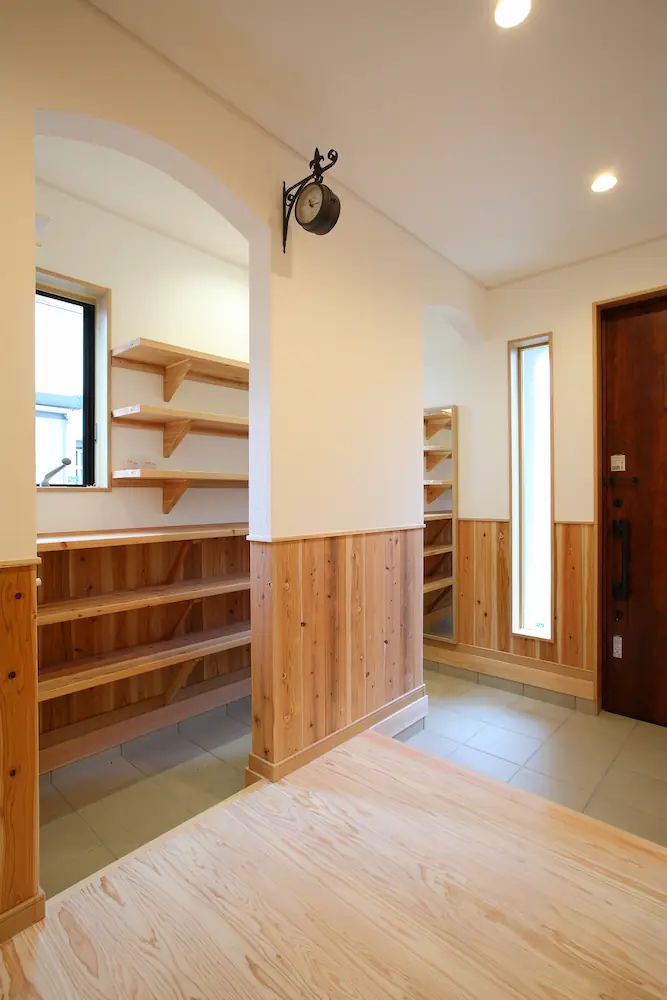 玄関には大容量のシューズクロークと造作棚を備え、帰宅動線をすっきりと整える工夫を。