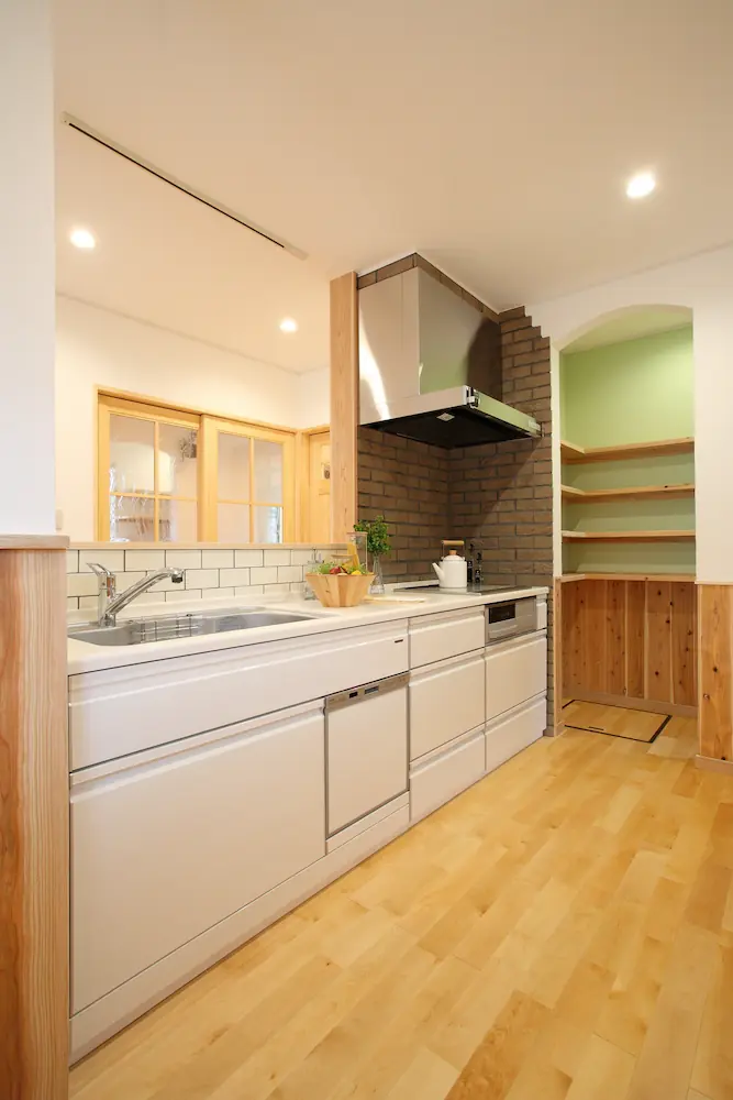 キッチン周りにはレンガ調のアクセントや造作棚を配置し、機能性とデザイン性を両立。