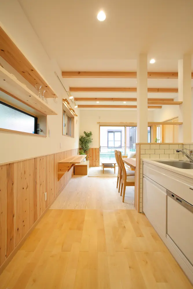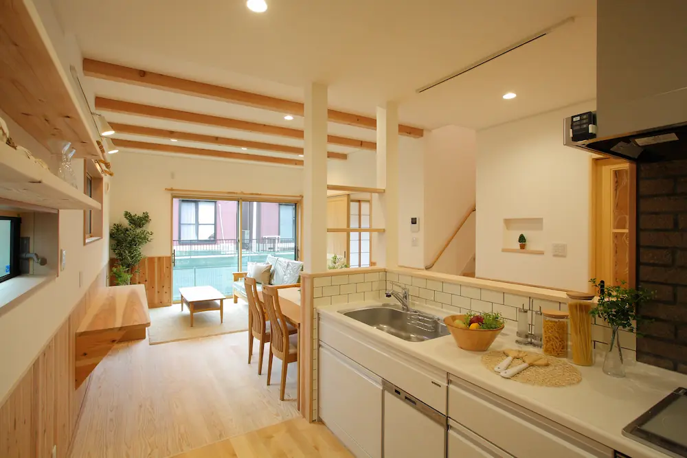 LDKは無垢材をふんだんに使った優しい空間で、キッチン・ダイニング・リビングがゆるやかにつながり、家族が自然と集まる心地よさに満ちています。
