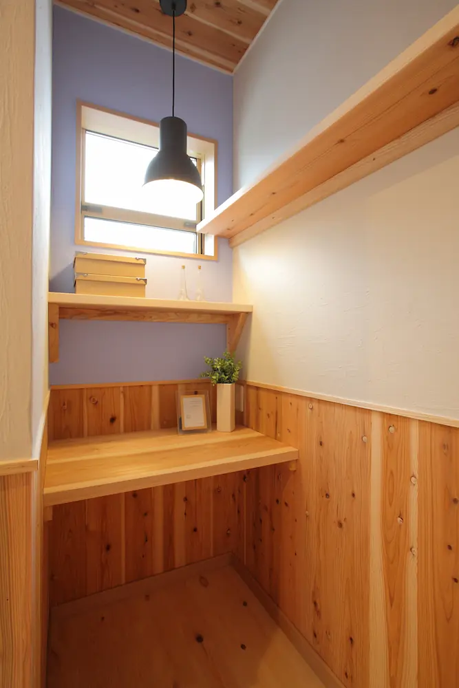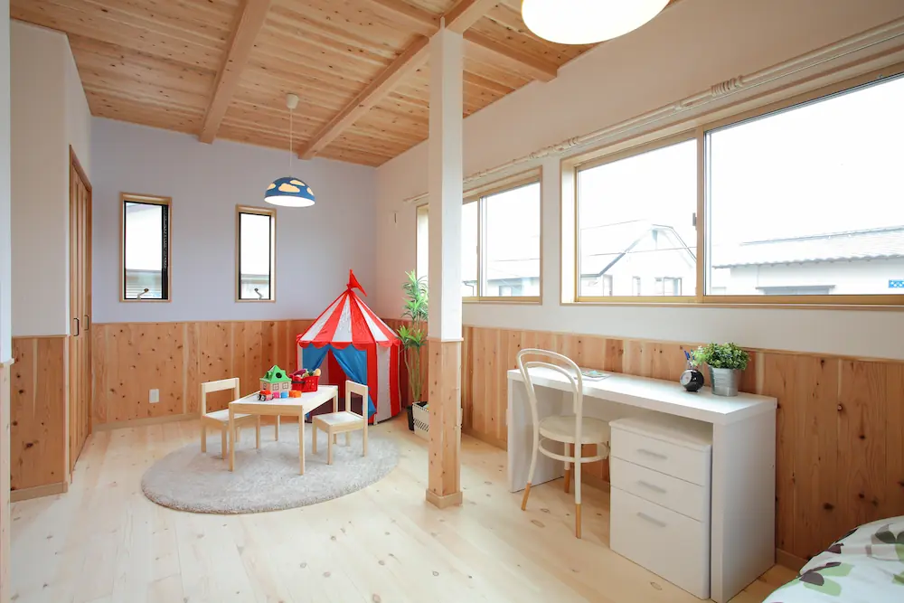 リビング横のワークスペースや、2階のスタディコーナー、子ども部屋にも無垢材を多く取り入れることで、家中にあたたかな一体感が広がります。